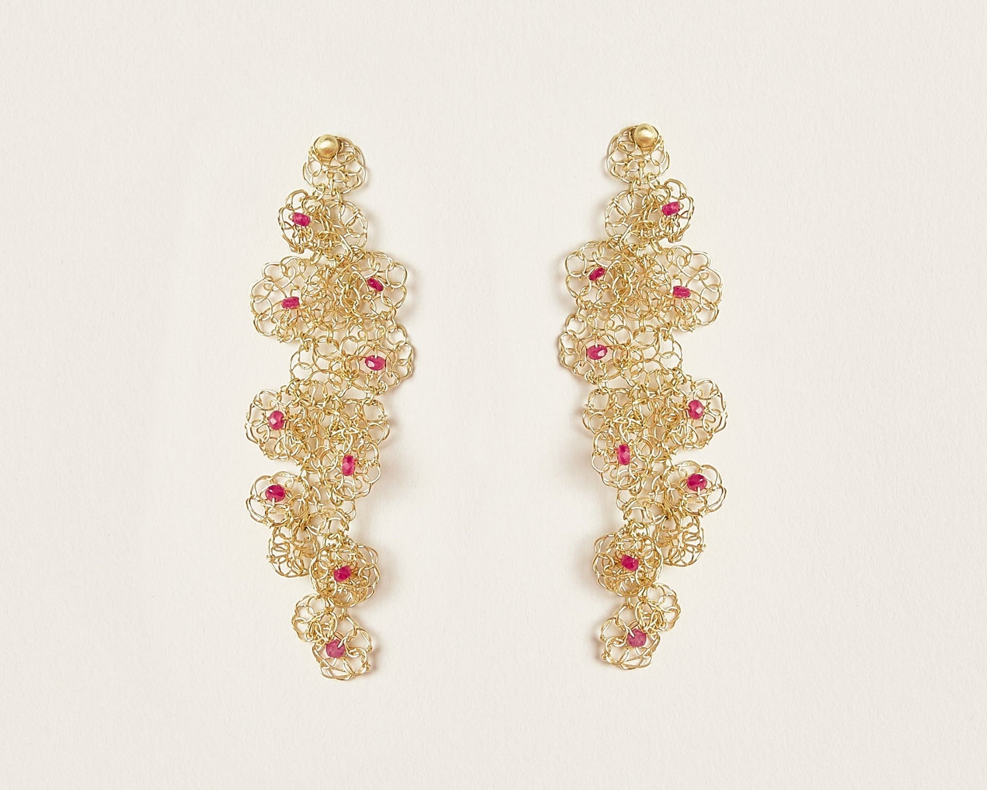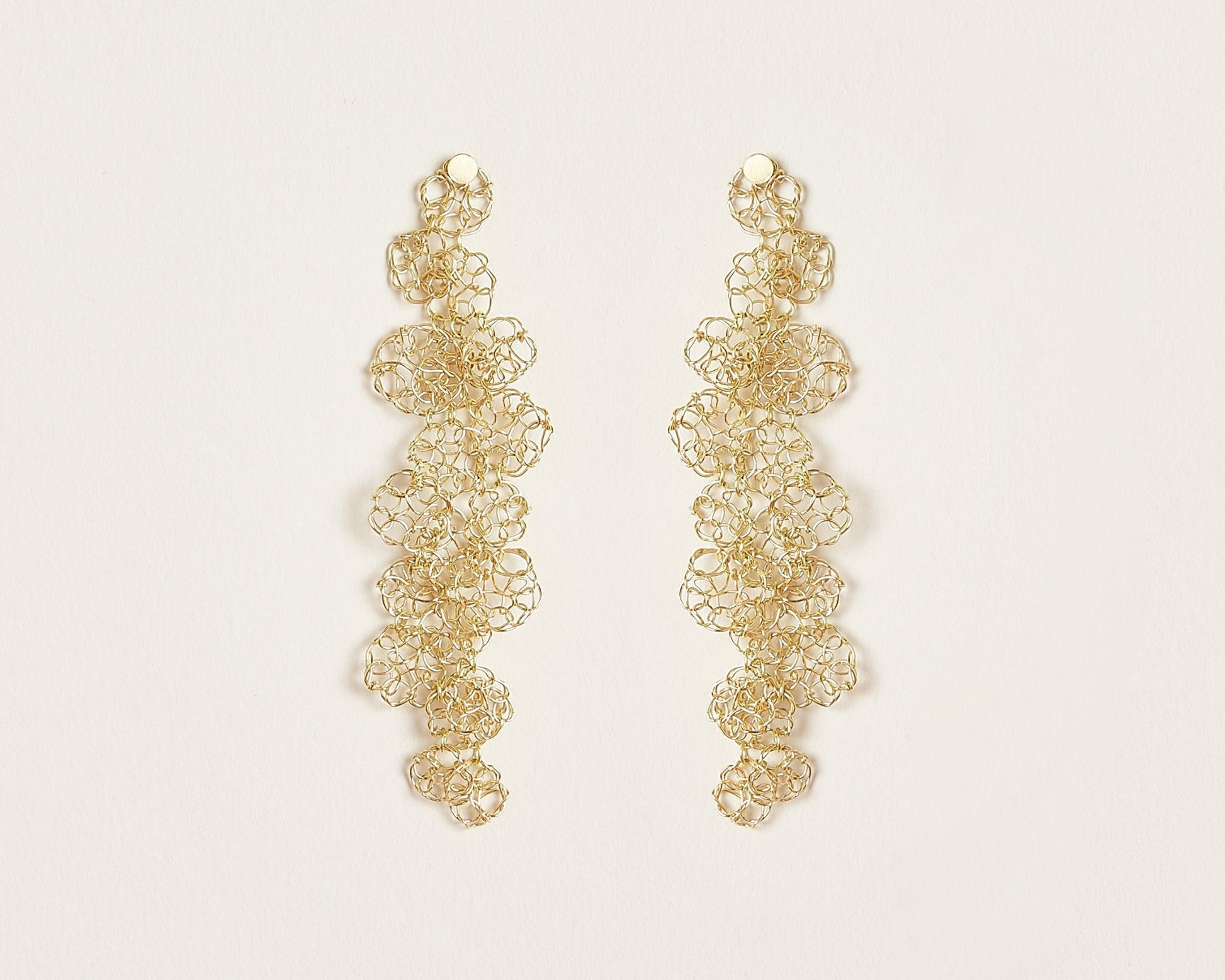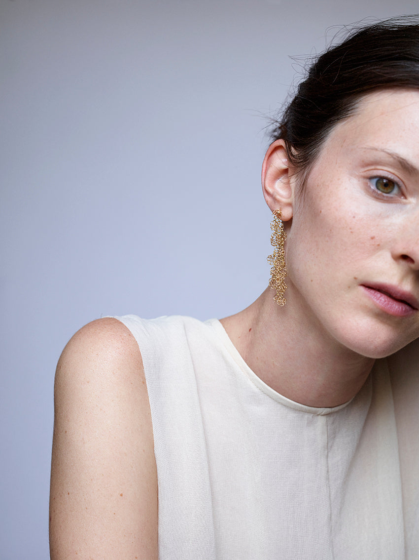 To create these exquisite lightweight earrings artisans in Lia Di Gregorio’s Milan atelier use embroidery crochet techniques to create precious small interlocking gold circles. This jewel is the result of a laborious creative process where drawing is key: the timeless beauty of Italian embroidery is here shaped for the contemporary woman. (6,5 cm long)