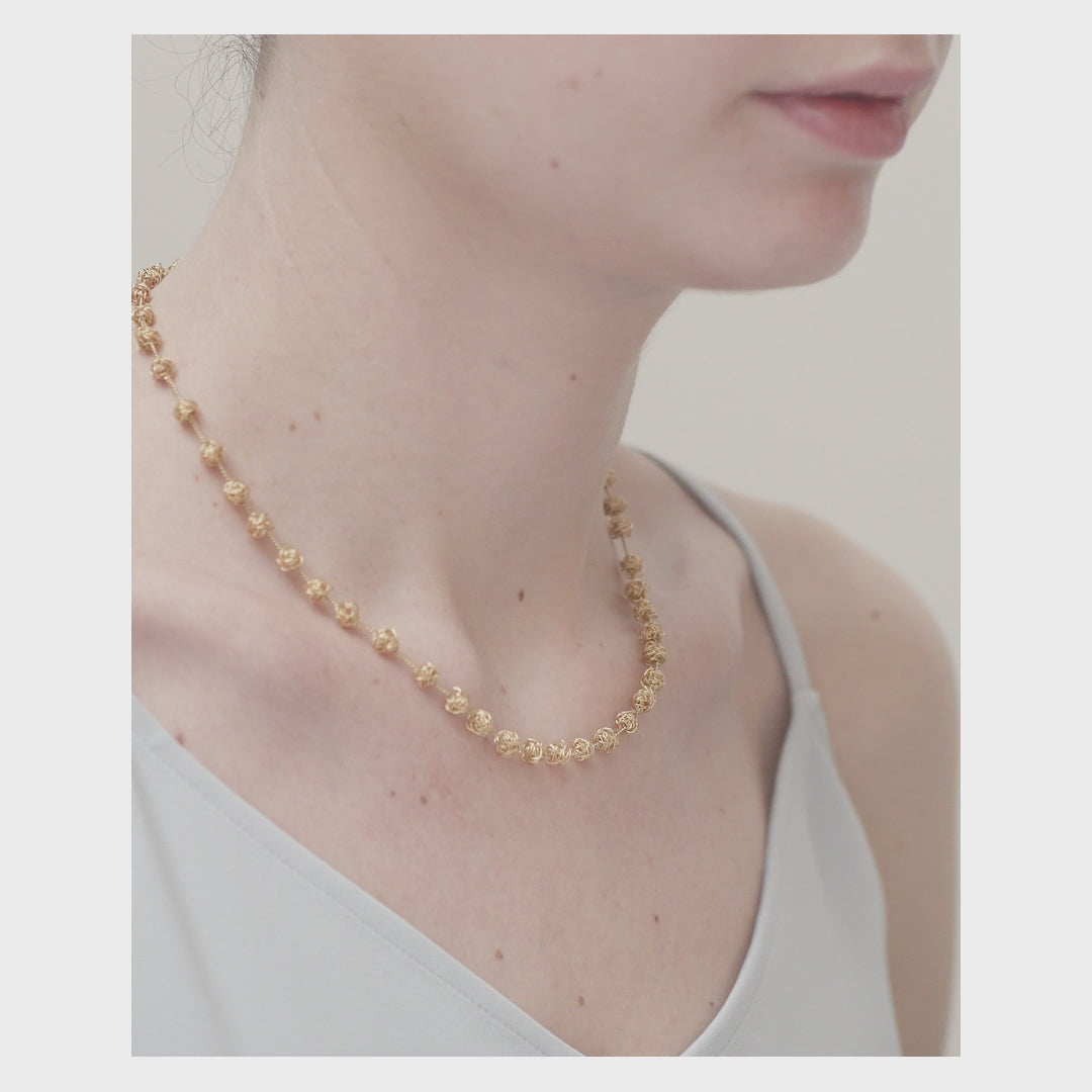 Short yellow gold 18KT necklace with freshwater pearls. The expert hands of Lia Di Gregorio carefully wrap a delicate gold thread around itself in order to create 44  small knots of gold thread yarn, some embellished by precious freshwater pearls. These delicate elements, all of slightly different dimensions, are elegantly placed along the length of the necklace, which is 42 cm long. This unique necklace is the result of over 20 hours of meticulous work, a creative process that transforms 11 meters of gold thread in this nonchalant yet striking piece of jewelry.